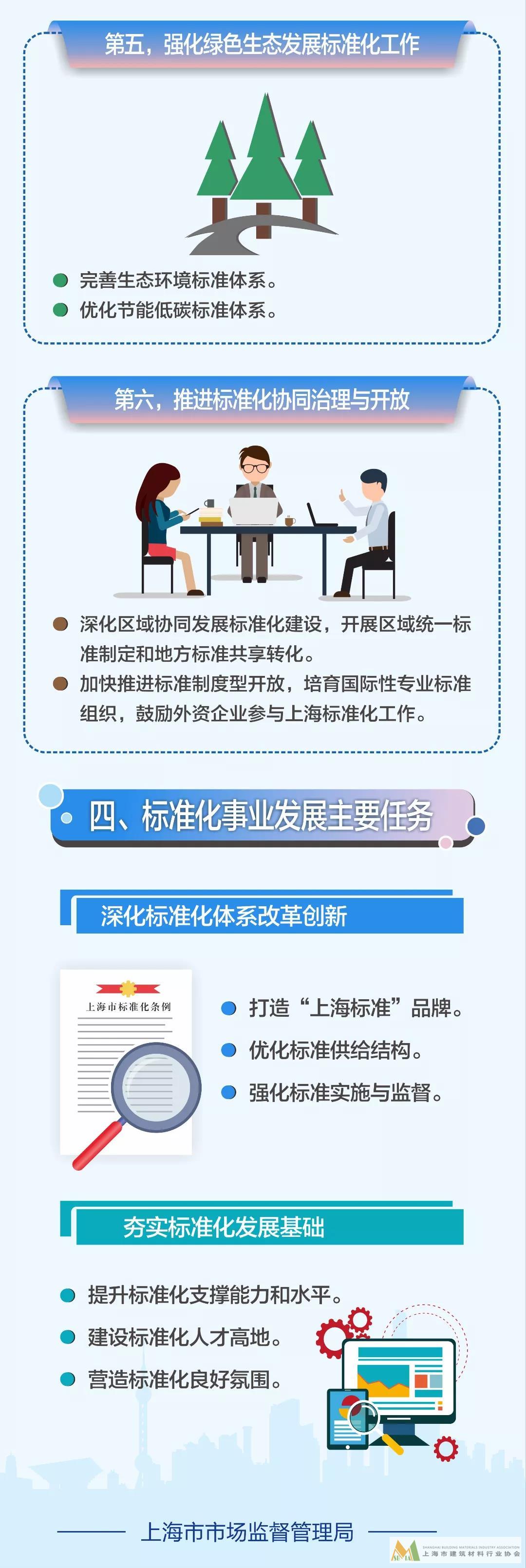 第三,更加聚焦協同和保障。一是夯實發展基礎。建設一批新型標準化技術組織,將產業集聚區、龍頭企業建設為技術標準創新基地;推動民營經濟標準化工作,以標準化為中小企業賦能,發展壯大市場主體。二是強化組織實施。建立部市標準化合作工作機制,深化長三角一體化標準化工作機制,推動區域標準協同。完善市、區標準化工作聯席會議制度,建立對各區標準化工作的評價機制。三是強化政策保障。發揮財政資金引導作用,積極引導社會資本投入,研究創設上海市標準創新貢獻獎,對做出突出貢獻的組織、個人,以及關鍵標準項目予以表彰。同時,要普及標準化知識,講好標準化故事,提升標準化意識,培育標準化文化,推動形成人人學標準、講標準、用標準的全社會共建共治共享的標準化工作新局面。